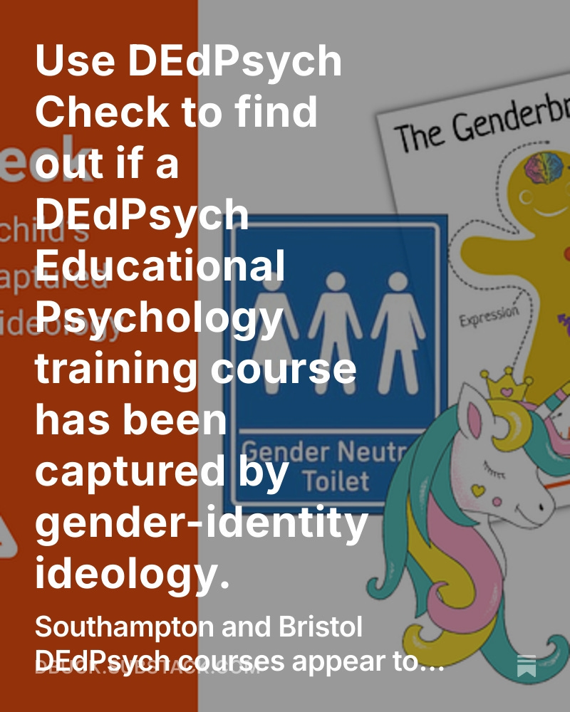 Just swap “DEdPsych” for “School” in this School Check to find out if a school has been captured by gender-identity ideology